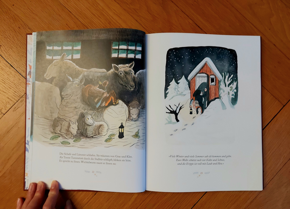 „Die Sterne funkeln am Himmel, der Schnee leuchtet weiß, es ist bitterkalt. Auf dem einsamen, alten Hof schlafen jetzt alle, aller außer einem… Tomte Tummetott.“