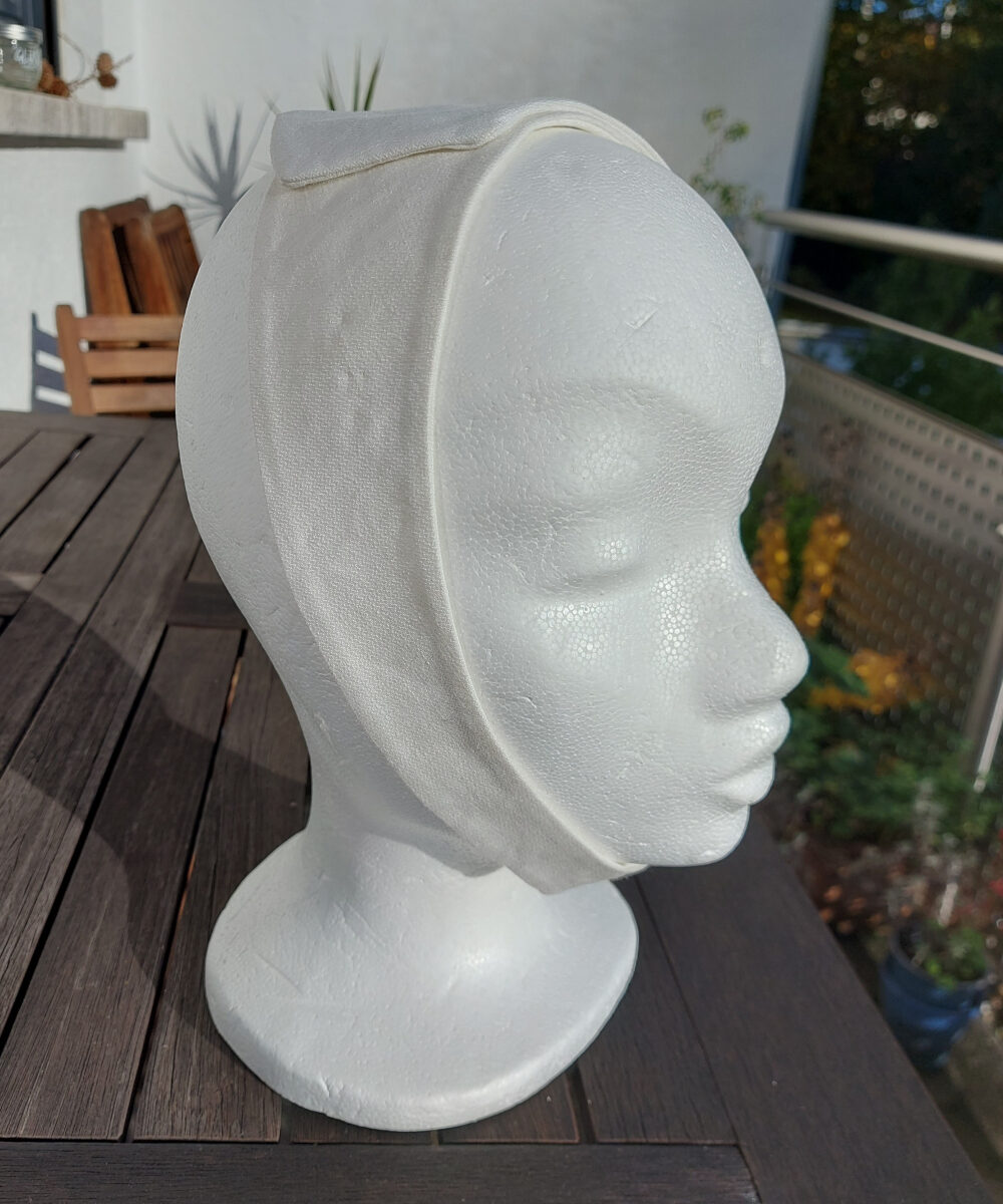 Hier ein von Hand genähter gebogener Streifen aus feinem Wolltuch, der um Kinn und über die Ohren gelegt wird und oben auf dem Kopf mit einer Gebendenadel (nicht im Lieferumfang enthalten) zusammen gesteckt wird.