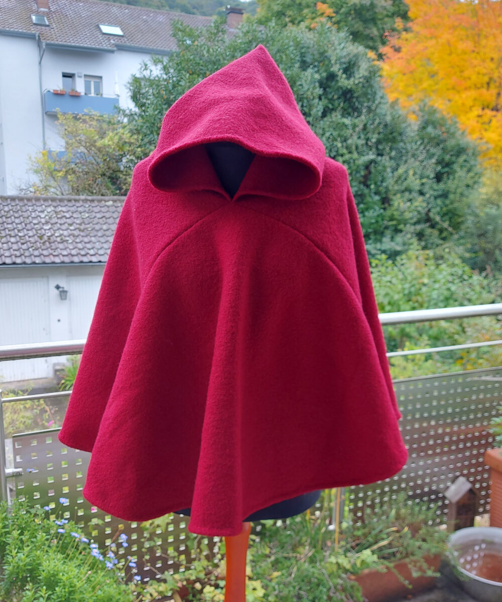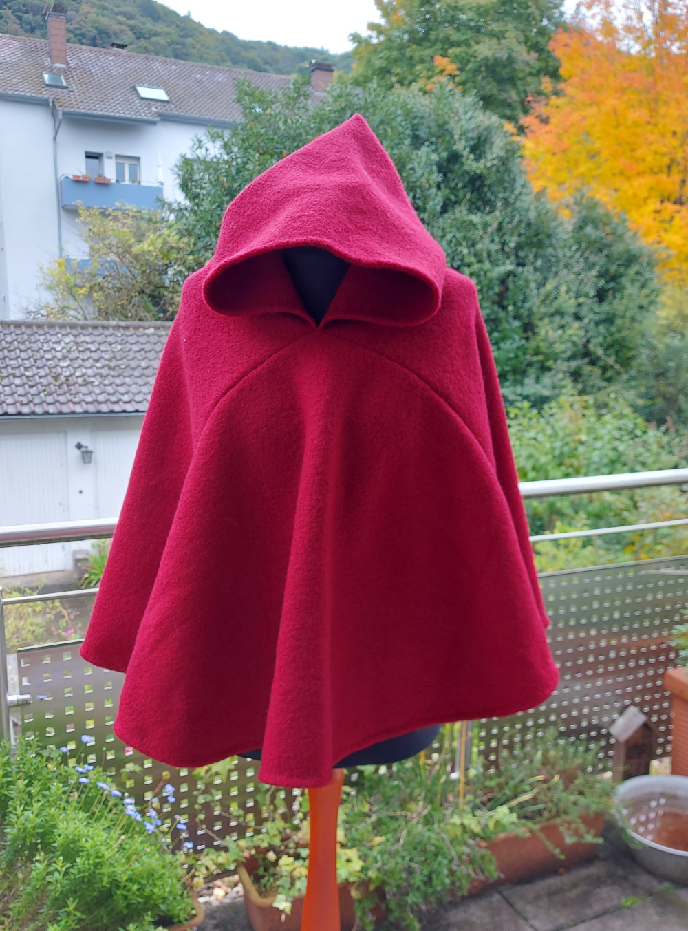 Gugel nach Skjoldeham-Schnitt aus 100% dicker roter Kochwolle, aber in rundem Zuschnitt. Damit es bei Wind & Wetter schön flauschig warm bleibt.