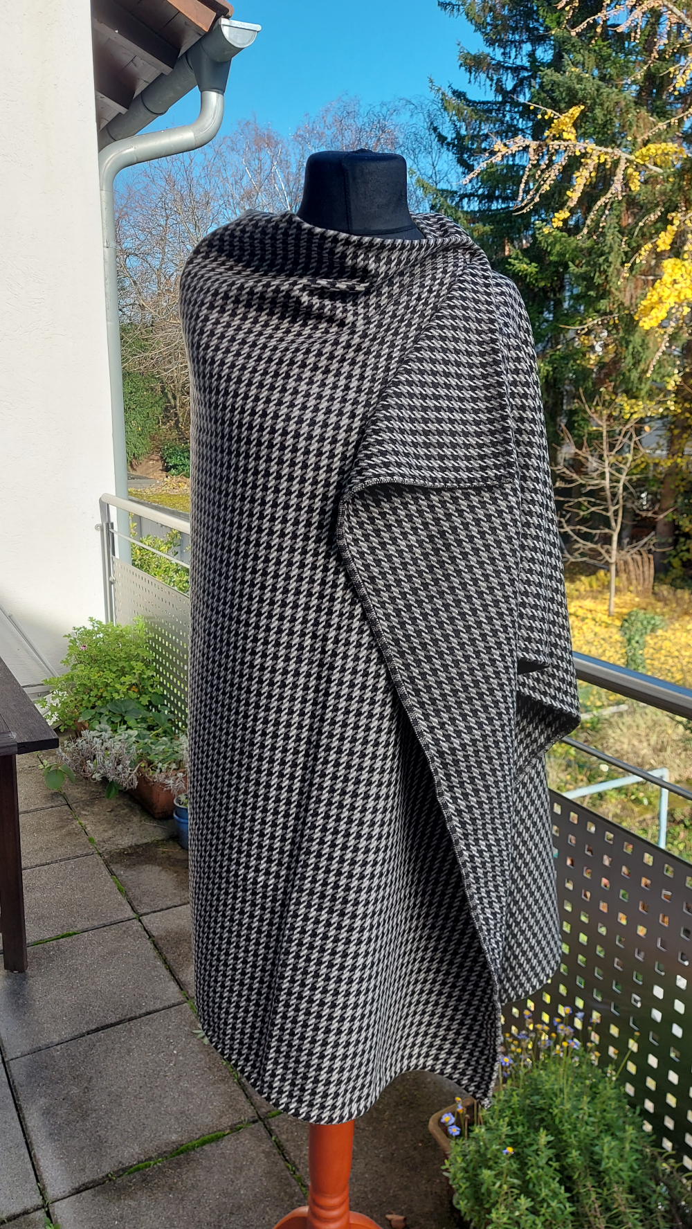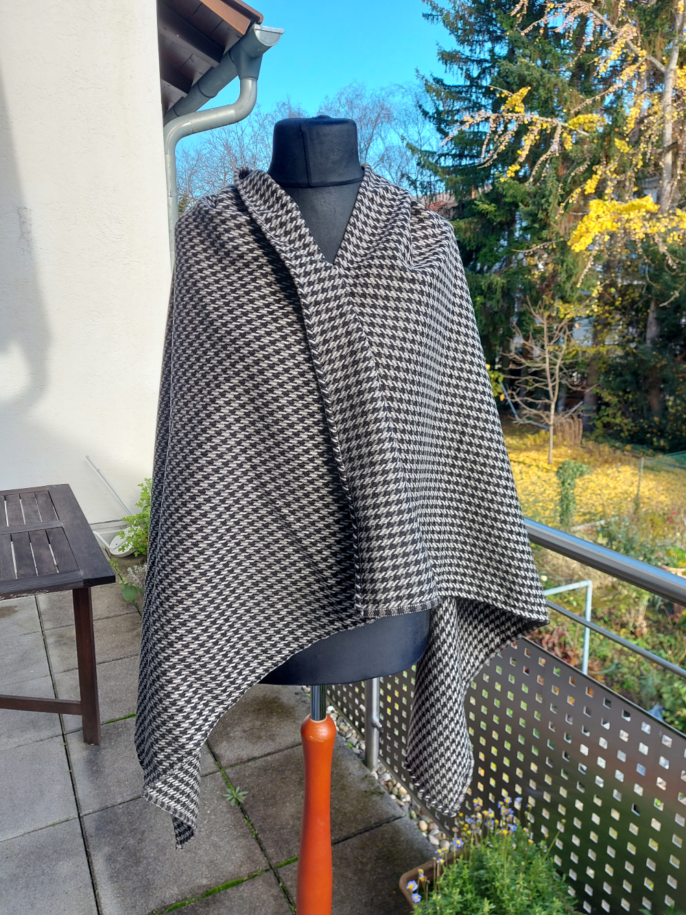 100% Wolle in schwarz-weiß-grauem Hahnentritt-Muster, von Hand umsäumt. Verschiedene Trageweise sind möglich, wozu eine Fibel nötig ist.